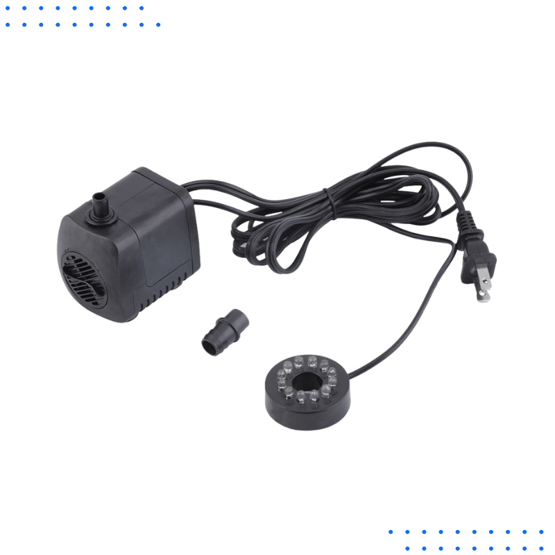 Compact water pump with LED lighting for aquariums, ponds, and fountains. Creates relaxing water effects for indoor or outdoor use.